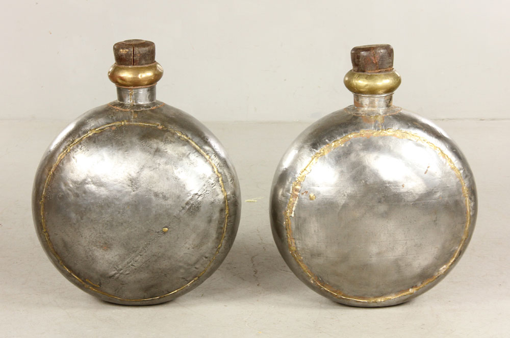 Pair of large decorative flasks, metal, with wood stoppers, 23" h (excluding stoppers) x 19" w