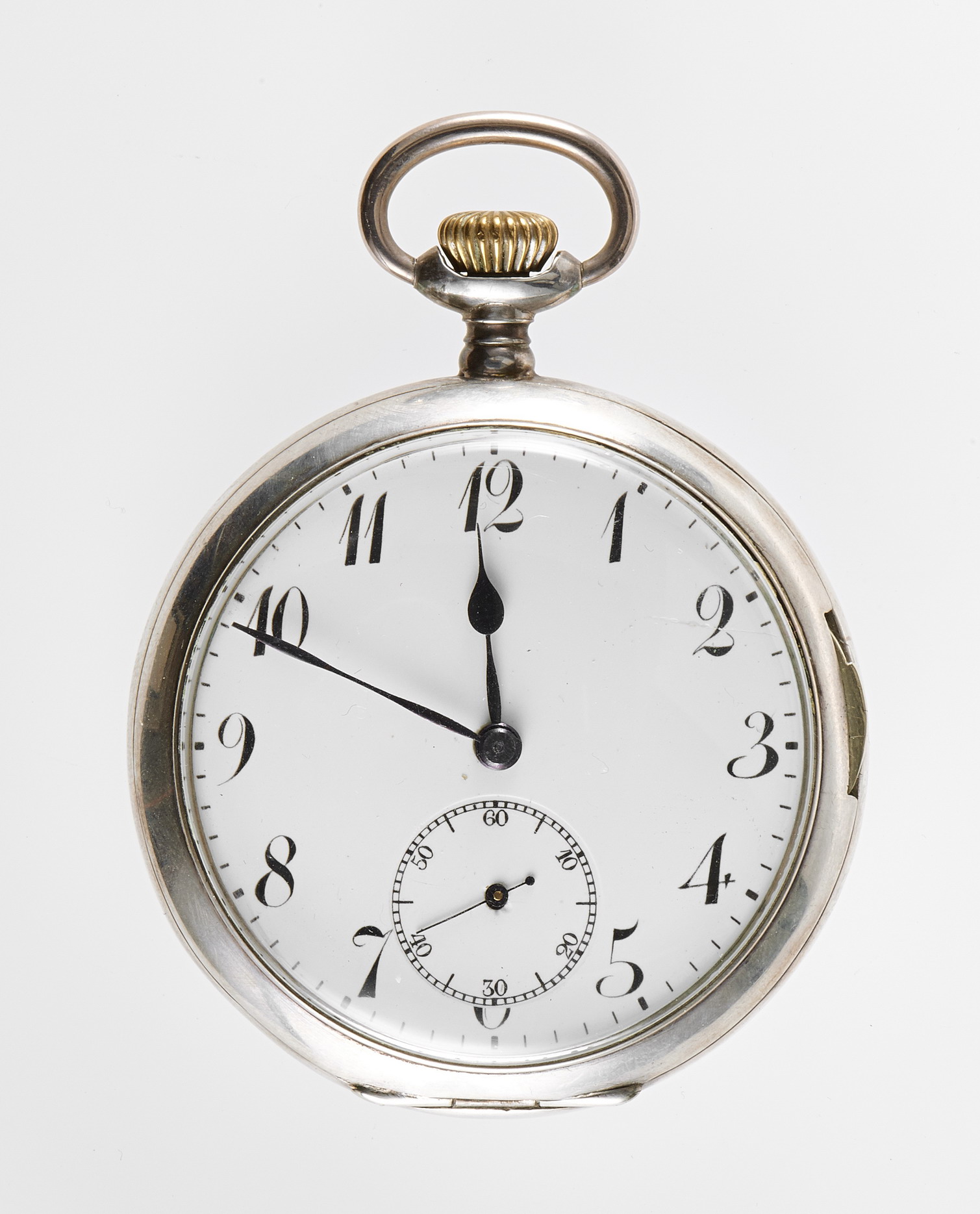 White dial, hands and black Arabic numerals, seconds at 6 o'clock, silver 800, D 53 mm