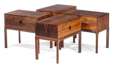 Quatre chevets à 2 tiroirs en placage de teck par Aksel Kjersgaard, Odder. Made in Denmark n°384, vers 1960-70.
