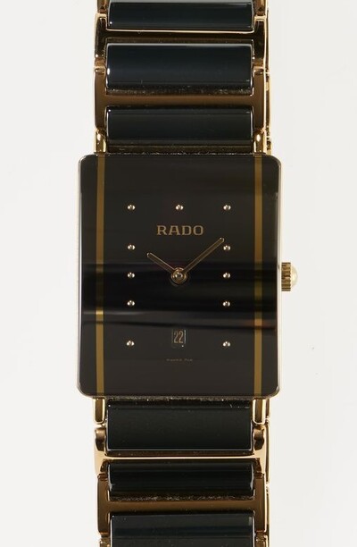 Black dial, gold-tone hands and hour markers, date window at 6 o'clock, ceramic bracelet, steel and gold-plated metal