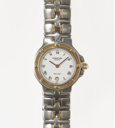 White dial, hands and black Roman numerals, date window at 6 o'clock, gold metal bezel, steel and gold metal