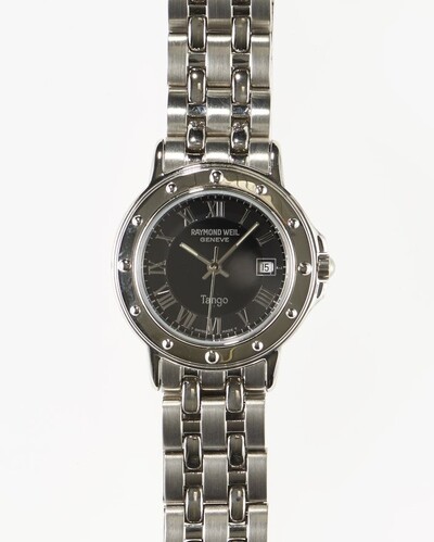 Two-tone black dial, silver hands and Roman numerals, date window at 3 o'clock, steel