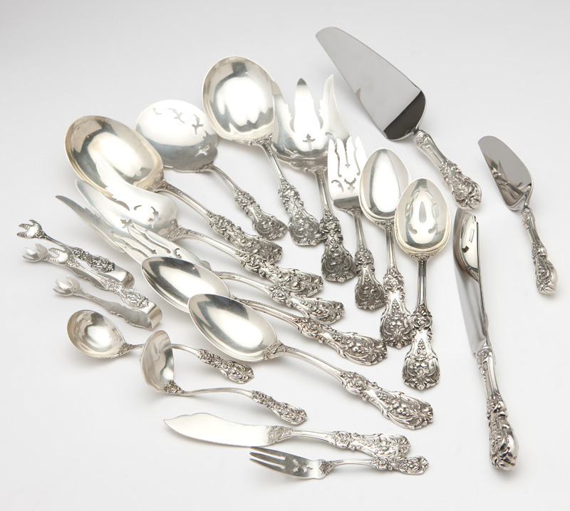 each with maker's marks, all but the hollow-handled articles further marked ''Sterling'', comprising 1 hollow-handled stainless steel-bladed cheese knife (7.25''), 1 hollow-handled stainless steel-bladed cake slicer (10.5''), 1 hollow-handled stainle