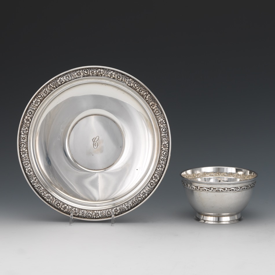 Reed & Barton Sterling Silver Bowl and Alvin Sterling Platter Reed & Barton sterling bowl with repousse floral design, footed, marked "Reed & Barton / sterling" and attached metallic label underneath, 5"D x 2 ⅞"; Alvin sterling shallow footed dish wi