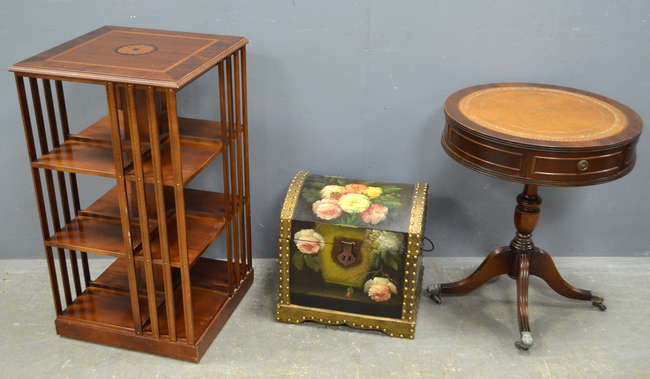Reproduction mahogany revolving bookcase, drum table and a painted chest