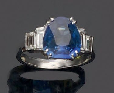 Ceylon certified "without thermal change" by the laboratory CGL, beautiful color, crimped by four claws supported double four baguette cut diamonds, total: about 0.80 carat, size: 54, weight: 5,5gr. gross