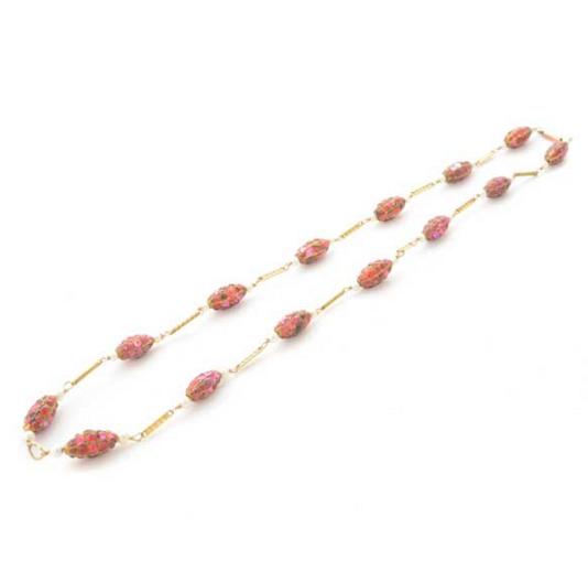 Composed of fourteen navette shaped gold-filled links, each featuring numerous round ruby cabochons and round glass cabochons, interspersed by twenty-eight cultured pearls, linked together by 14k yellow gold bar links, forming a 25 1/2 inch necklace.