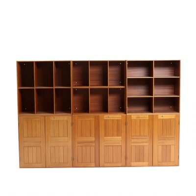 A mahogany wall unit comprising three cabinets, two deep- and two half bookcases