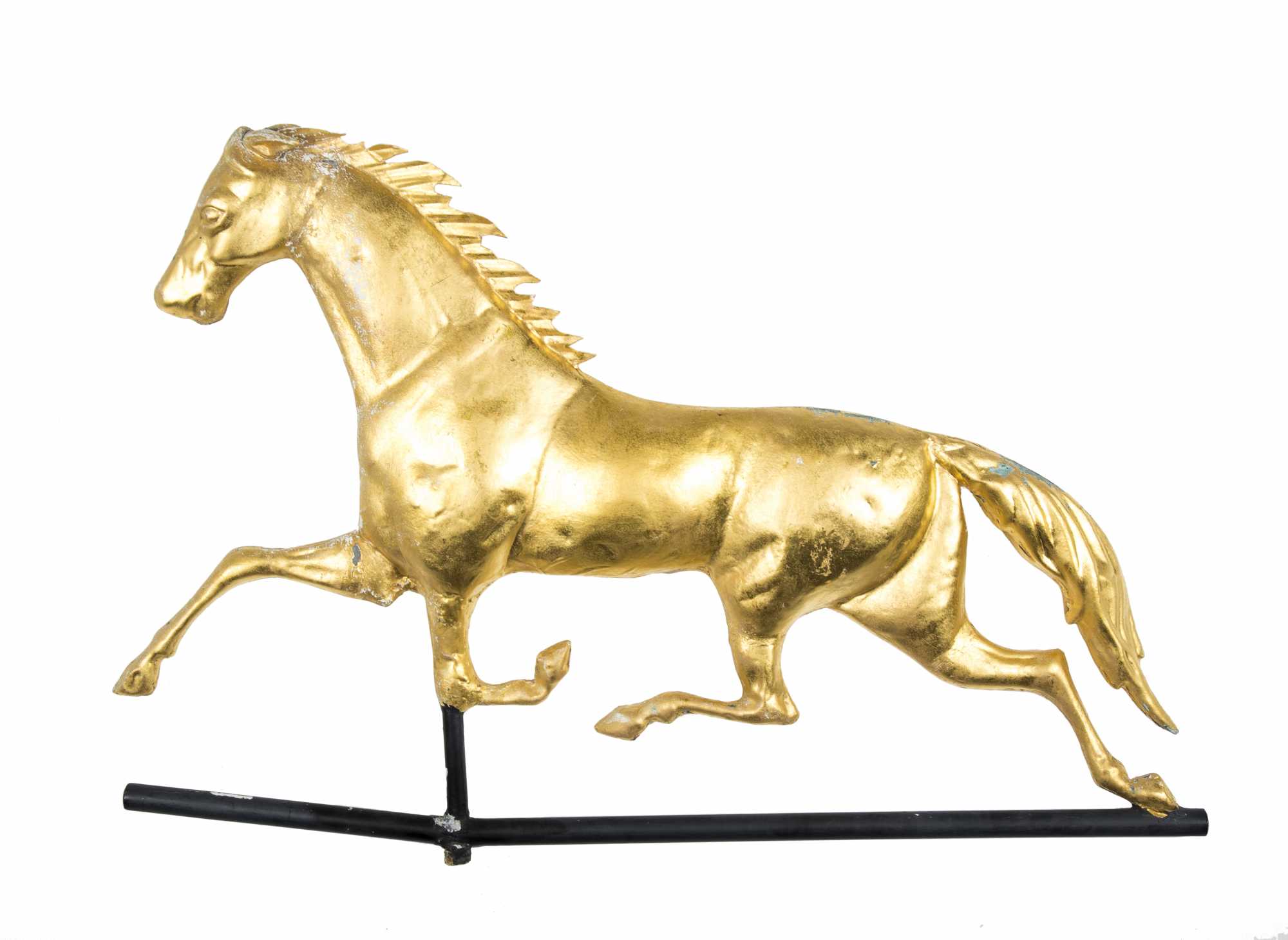 hollow copper boddy horse with cast zinc ears having an old gold paint over the old green weathered surface (traces showing on the edges of the old surface)
