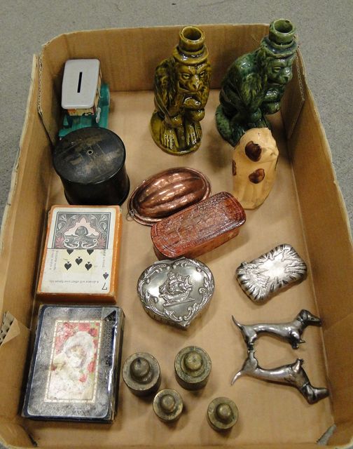 Samlarlåda bl.a. whiskey karaffer i form av apor, spargris i form av katt, askar, vikter m.m, karaffer och katt med skador