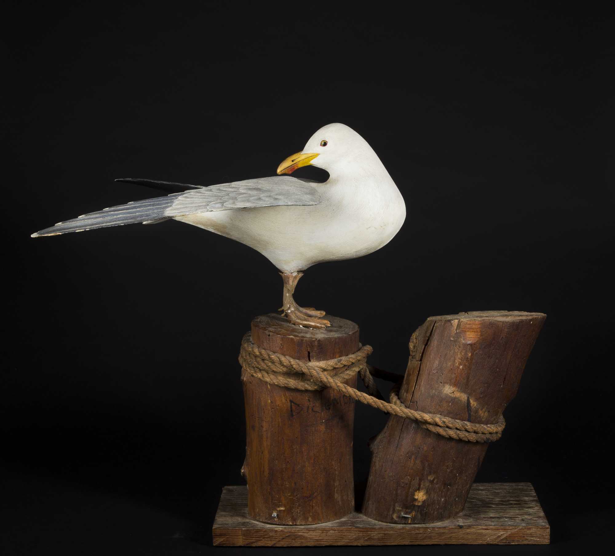 A finely carved and painted wooden seagull with his head turned standing on a wooden pile top, 25" tall X 27" wide X 8 1/2" deep, there is a hand written name on the piling side (hard to read) dickembie? maker?, some damage to the seagull's legs, 20t