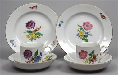 Tassen in Becherform mit Asthenkel. Bunte Blumenmalerei "Blume 3". Goldrand und -staffage. Rand 1 Untertasse min. best. Schwertermarke Meissen, 2. H. 20. Jh. 2. Wahl. Gebäckteller D. 19 cm.