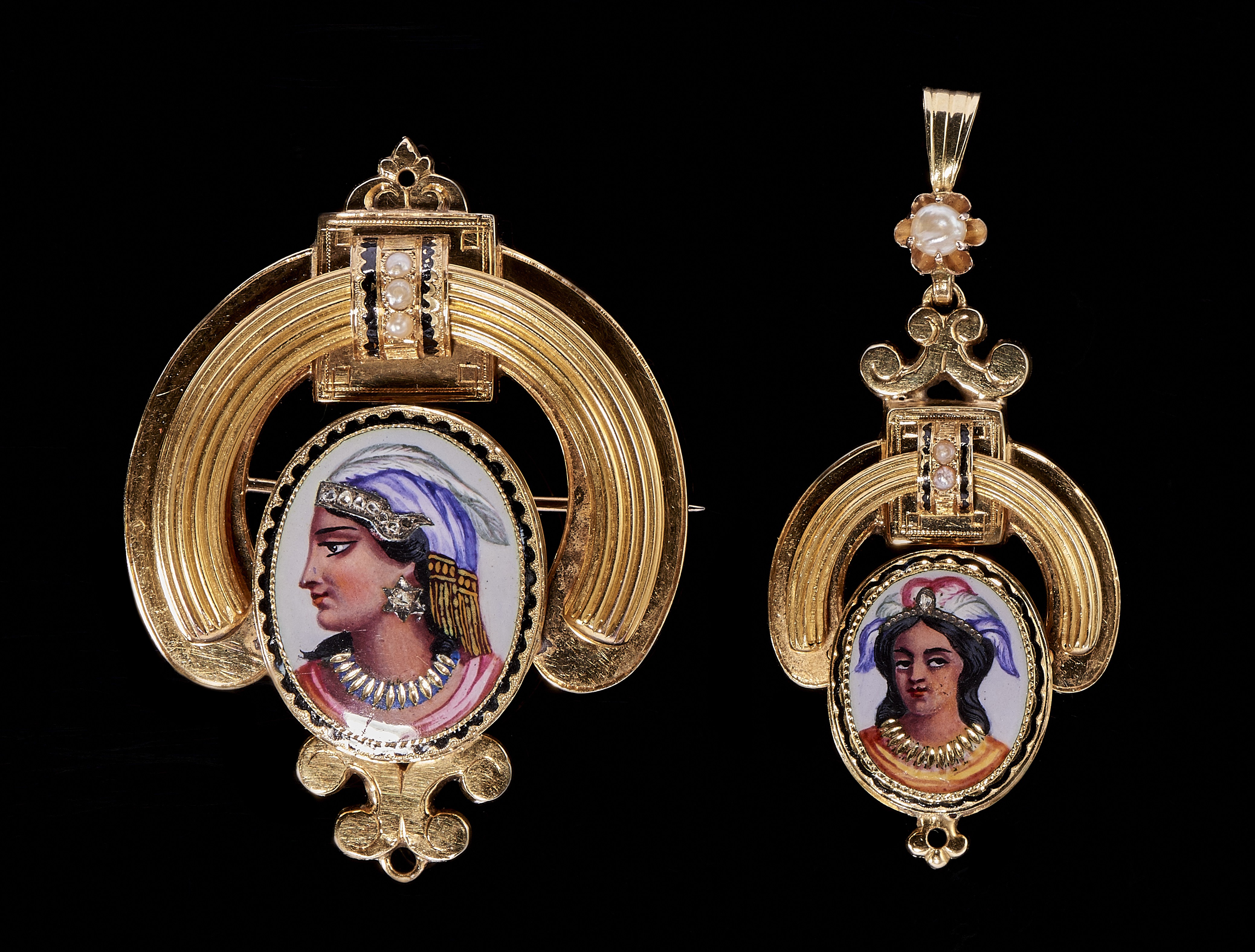 Set of brooch and pendant set with painted American Indians portraits embellished