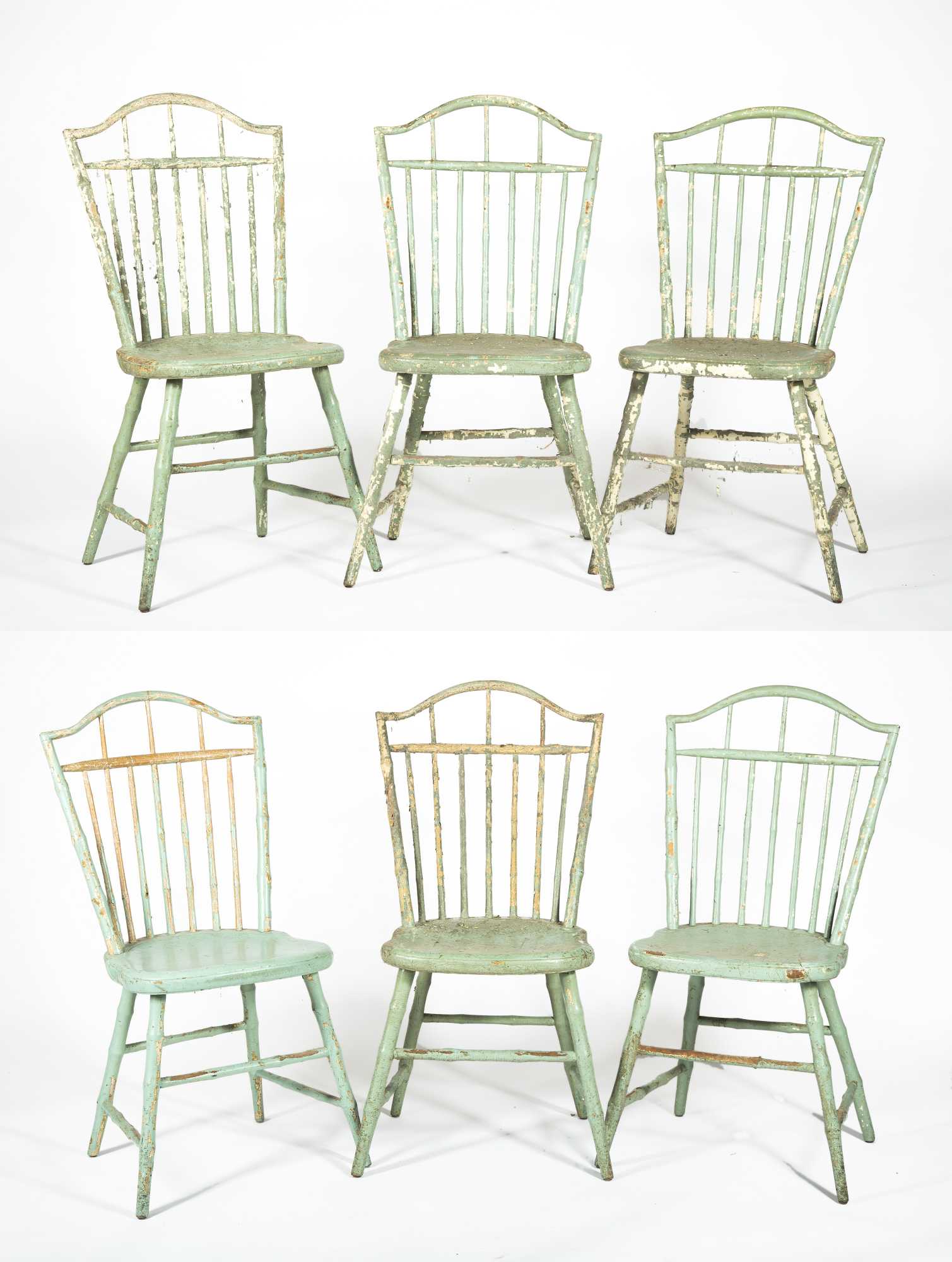 having a rare arched crest, bamboo turnings and molded plank seat, old peeling green overpaint, 37 12", local NH history C1800-1810