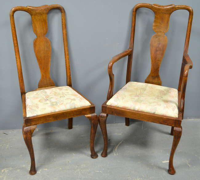 Set of six oak Queen Anne style dining chairs with drop-in seats on cabriole legs (2+4)