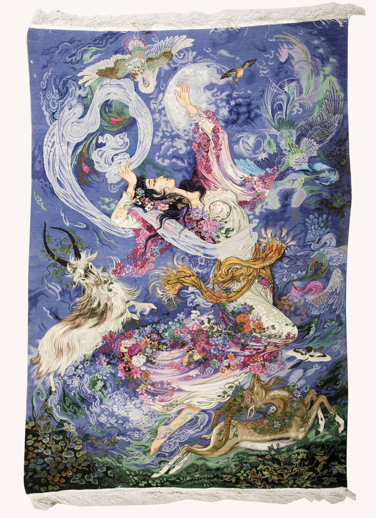 shows a woman surrounded by flowers, animals and birds, 3' 5" X 4' 9", in like new condition