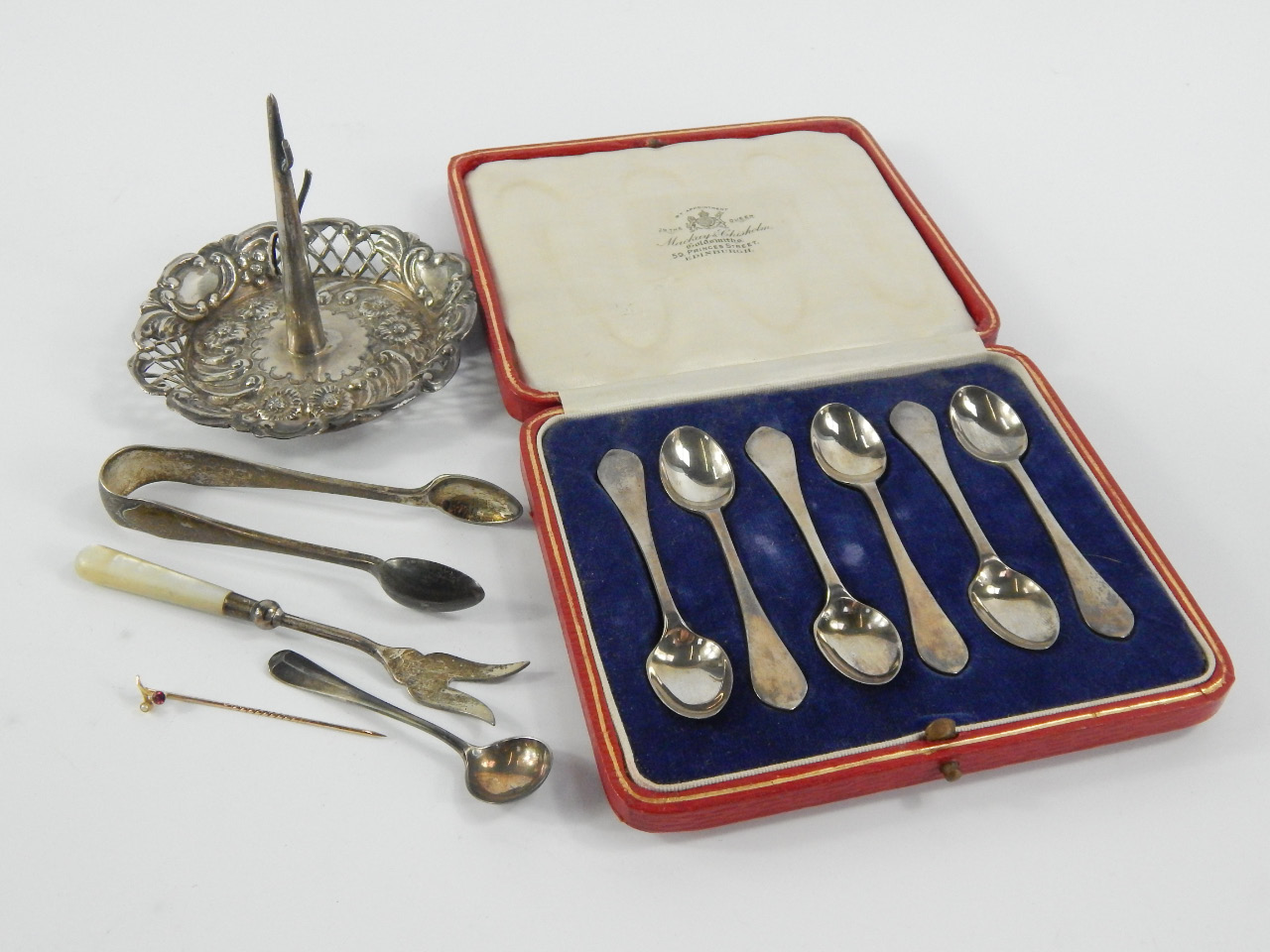 Silver, comprising six coffee spoons, cased, a pair of sugar tongs