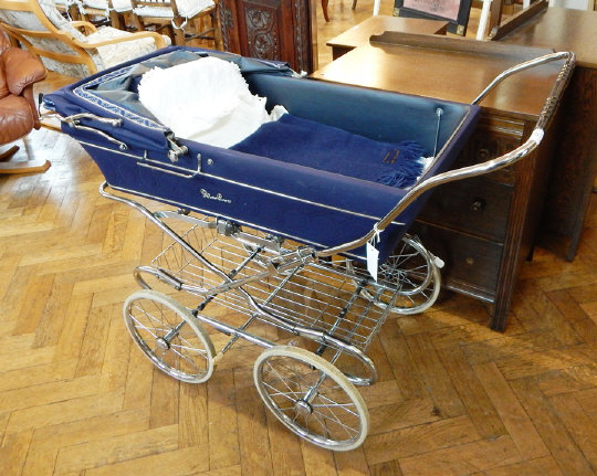 Silver Cross blue baby's pram on silver tubular metal folding base