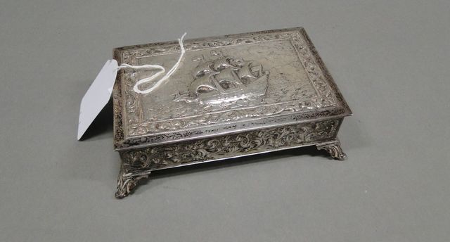Skrin, silver med skeppsdekor 1946, L12,5cm, total vikt 249g, baksida med gravyr