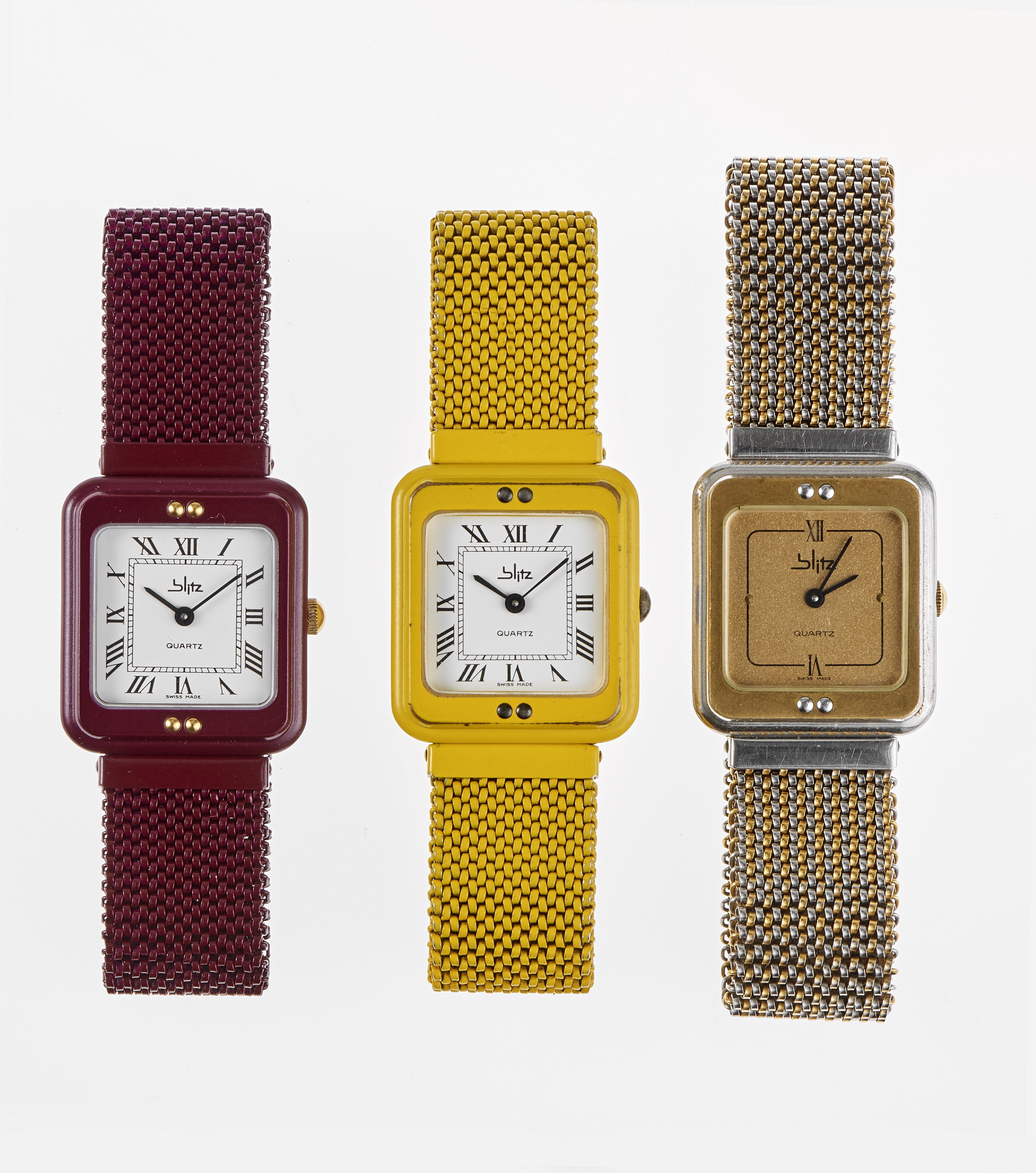 Two with white dials and one with a golden dial, black hands and Roman numerals, yellow, burgundy, and silver plated extensible bracelets, steel, 28x25 mm