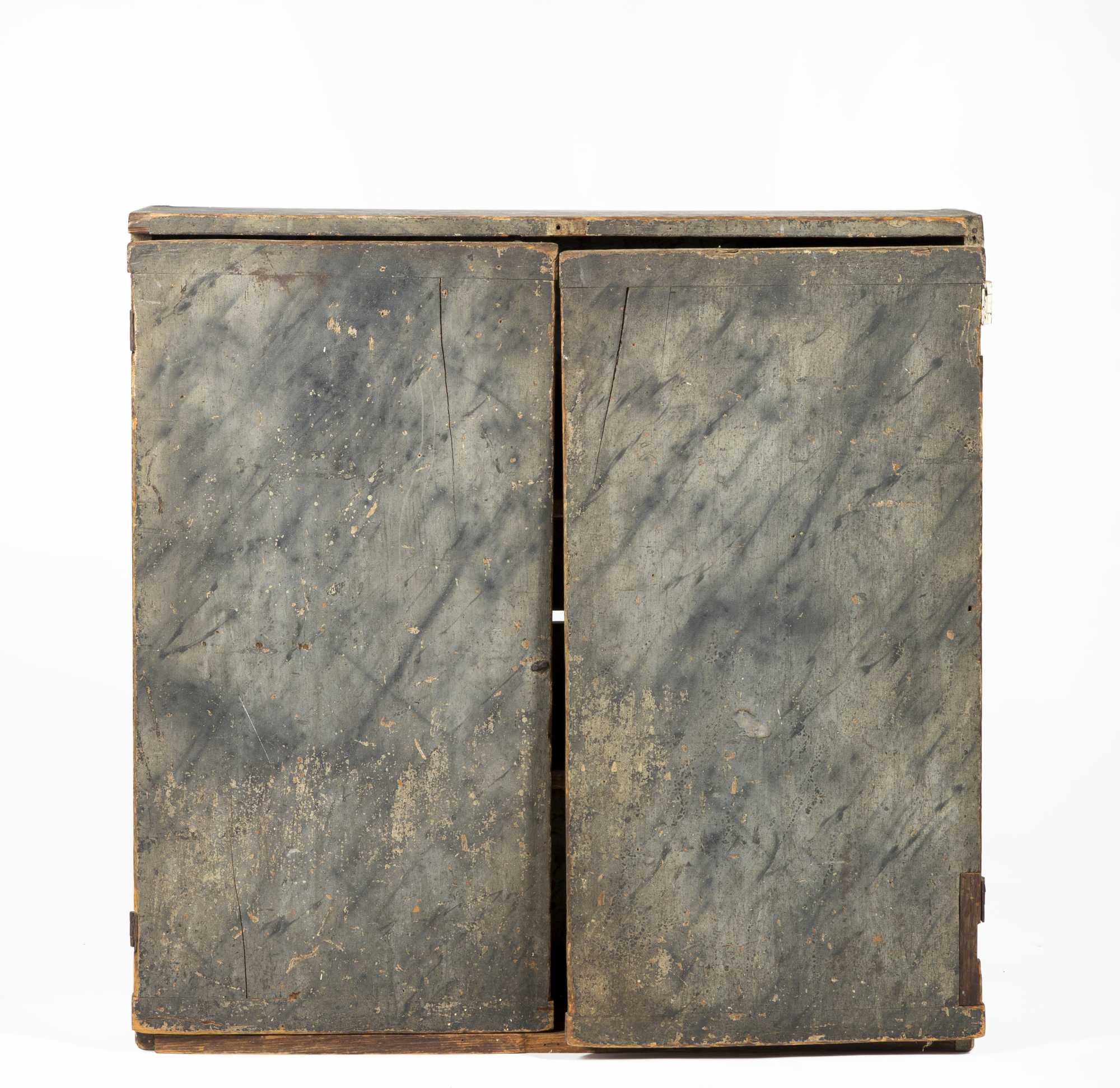 all over paint decoration on two single board doors with 3 interior shelves, dovetailed case 30" wide X 29 1/2" tall X 8 1/2" deep, some wear and losses, E19thC probably NH.