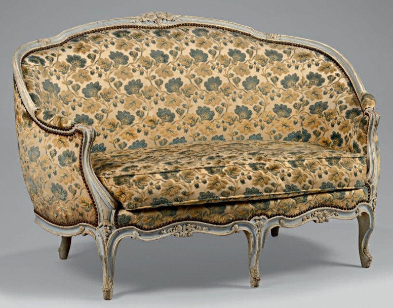Sofa alcove wooden blue relaqué rechampi cream, molded and carved with flowers, headlines armrests and curved