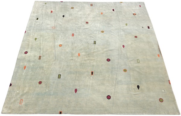 13'4" x 13'11" Himalayan wool on cotton weft. Thick silky pile in light blue with gem stone shapes, comes with carpet pad. Handmade.