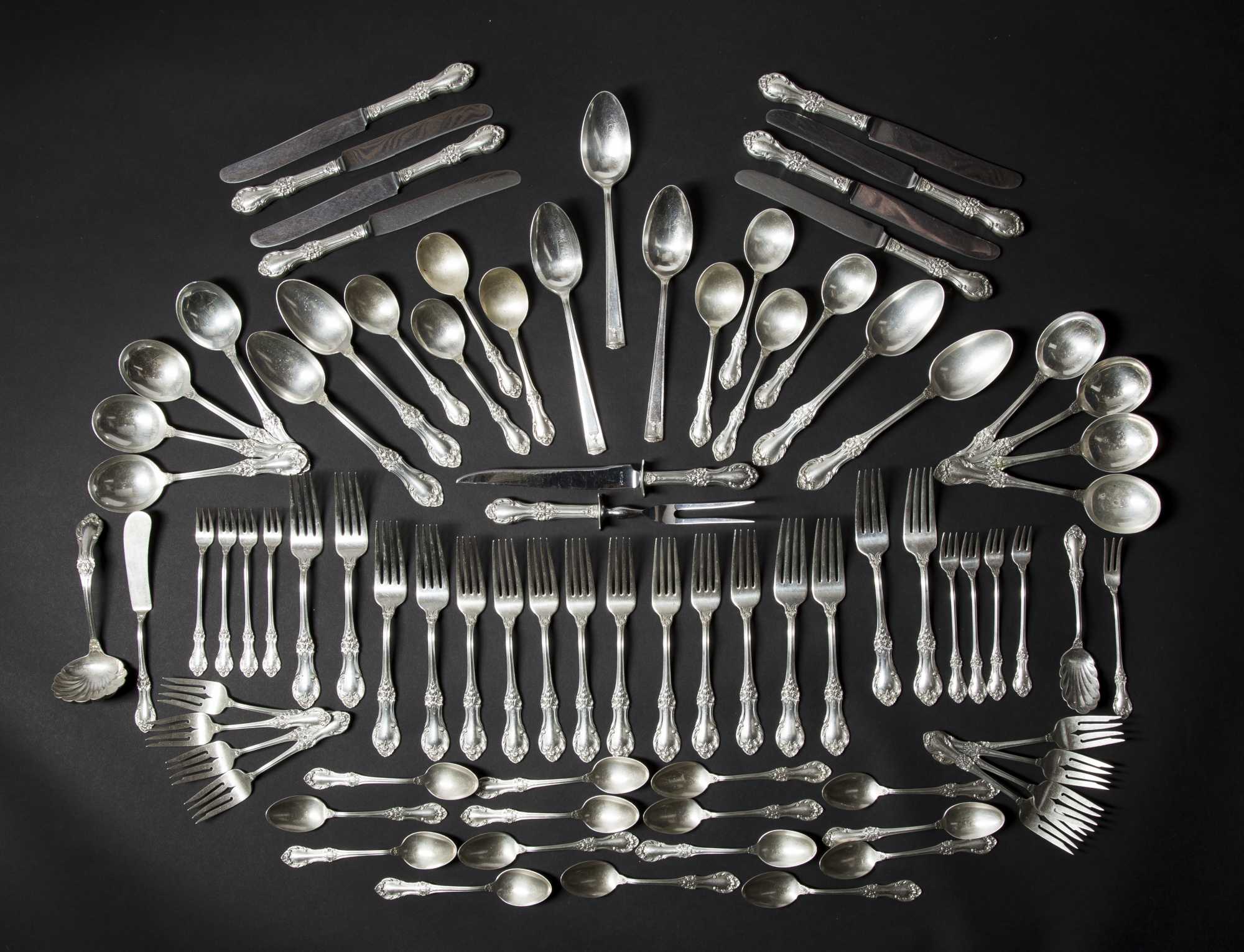 Consisting of knives, 4 sizes of forks, 2 sizes od soup spoons, 15 teaspoons. 4 tablespoons 4 misc serving pieces and a carving set, 89 Toz not including the knives and carving set