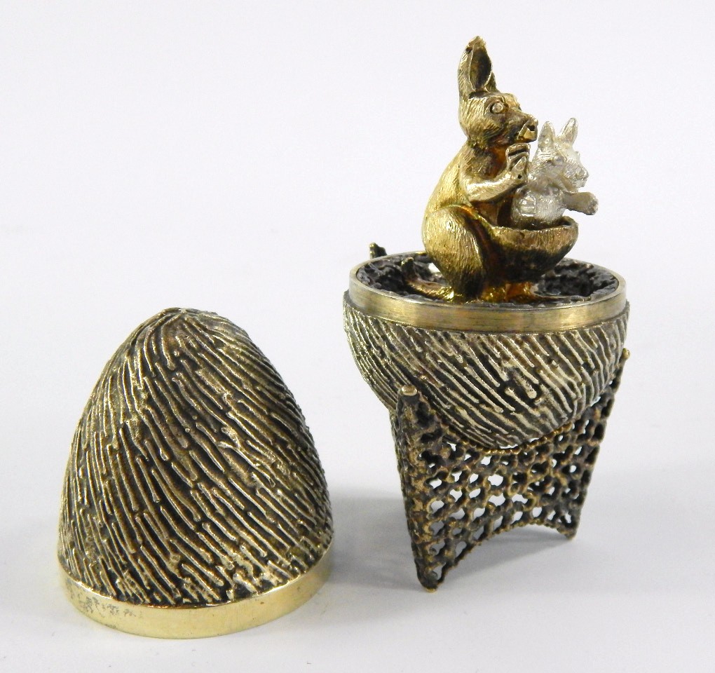 the top opens to reveal a kangaroo with baby in pouch mounted on a spring with display stand and leather case, London hallmark, 8oz approximately
