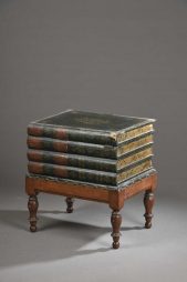 Formant siège d’aisance en bois laqué et cuir, le haut à décor de livres empilés, Voyages des Pays-Bas. Il repose sur des pieds balustre à bagues.