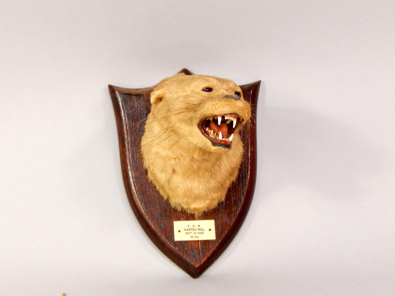 oak shield mounted by P Spicer & Sons, Leamington, impressed marks, bears plaque C.O.H. Haxted Mill, Spet 14 1929
