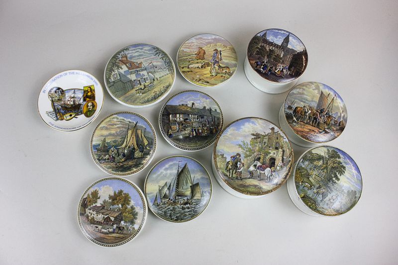 Ten various ceramic pot lids, four with pots, depicting nautical, countryside and village scenes, together with a Millennium dish