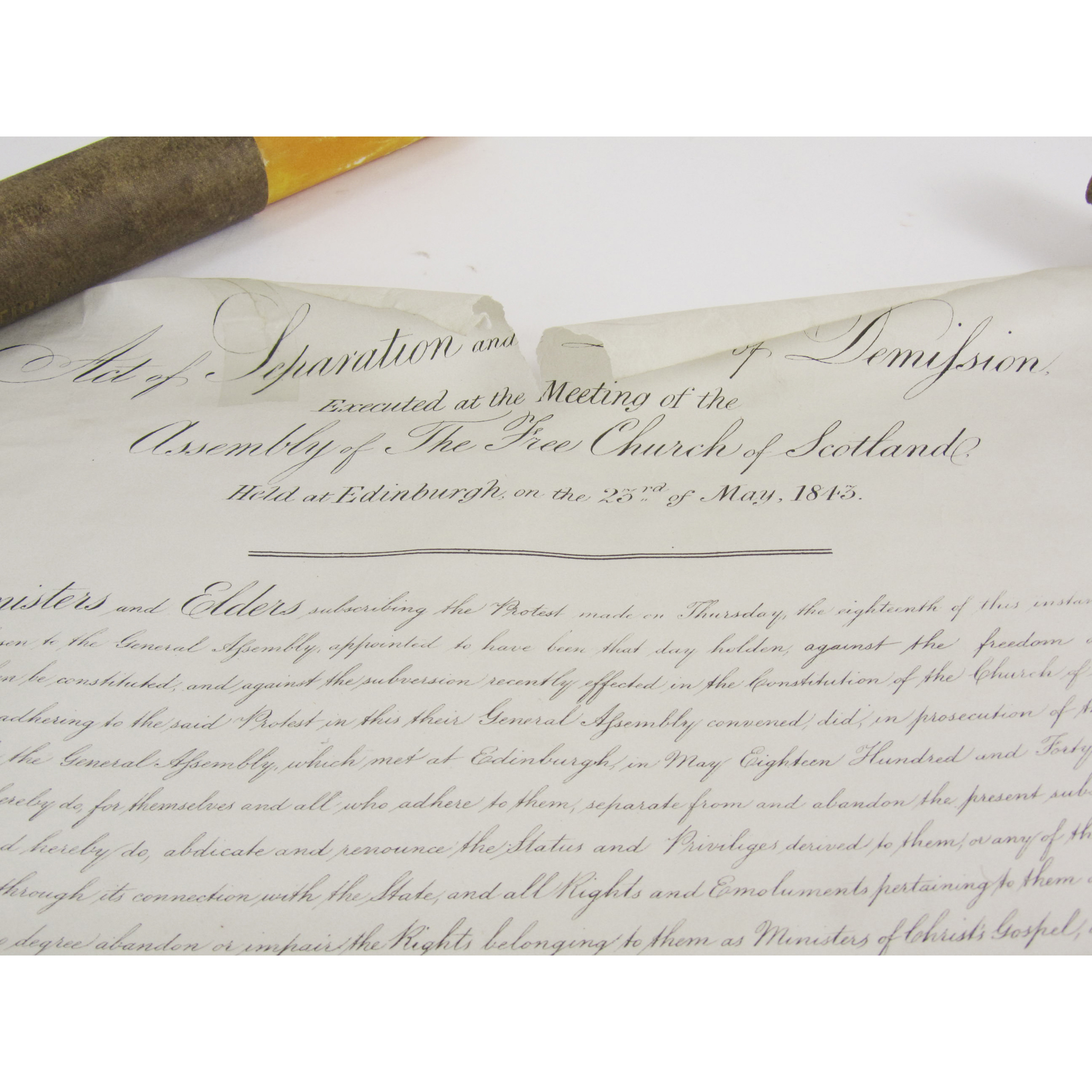 Act of separation and deed of demission executed at the meeting of the Free Church of Scotland, held at Edinburgh, on the 23rd of May, 1843. Edinburgh: W. and A.K. Johnston, 1843. Printed on a rolled paper scroll, 220 x 39cm, torn at base with some l