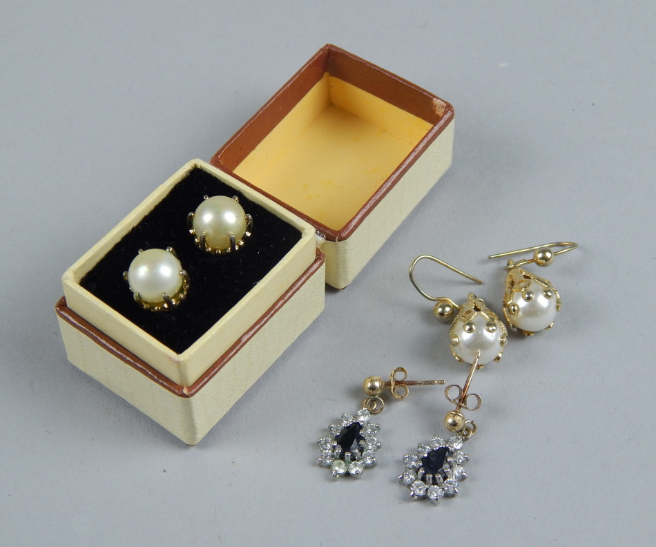 Three pairs of earrings, to include two set with cultured pearls, yellow metal, unmarked, and another pair