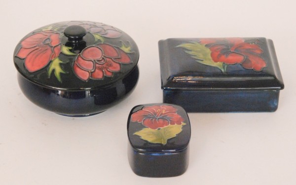 Three pieces of Moorcroft comprising an Anemone pattern powder bowl and cover, and two Hibiscus pattern trinket boxes, all with impressed marks (3)