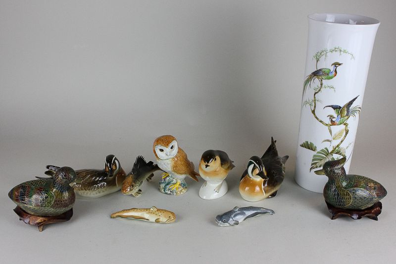 Three Russian porcelain models of birds, a Beswick owl, a pair of glass ducks, three Russian porcelain fish and a Kaiser porcelain vase depicting birds in foliage