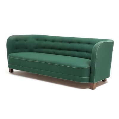 Three seater sofa with stained beech legs, upholstered with green fabric