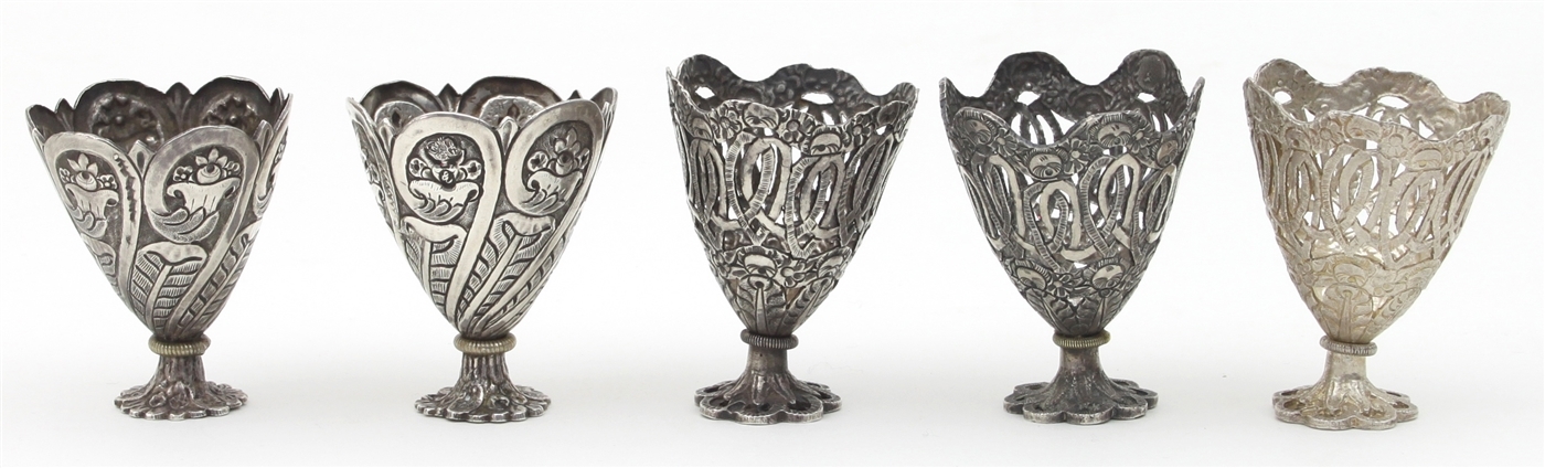 Three Turkish silver zarfs, with pierced sides and a pair of zarfs (5)