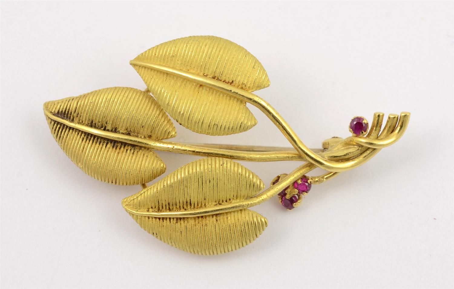 Tiffany & Co 18K Yellow Gold and Ruby Floral Pin, with original tooled box, 1-3/4, 3.7 dwt.