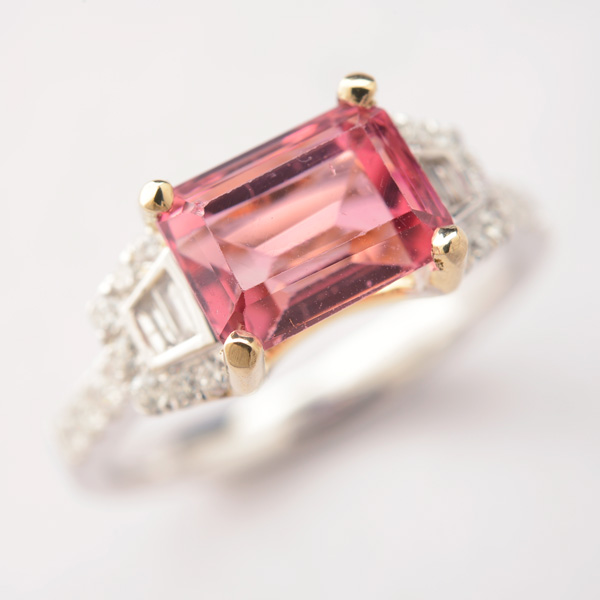Featuring one emerald-cut tourmaline weighing approximately 2.20 cts., accented by four baguette-cut and twenty-two full-cut diamonds weighing a total of approximately 0.40 cttw., set in an 18k white gold mounting. {Gross Weight: 6 1/2, Gross Weight: