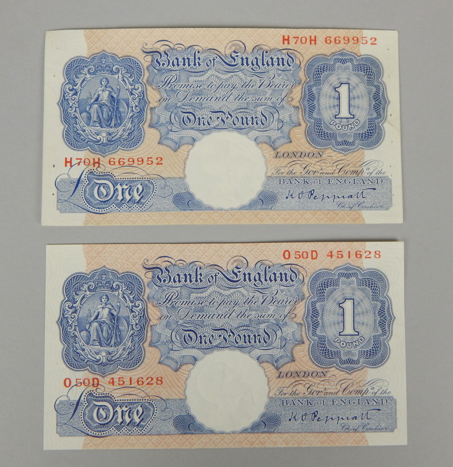 Two blue £1 notes, chief cashier Peppiatt, numbered 451628 and 669952.