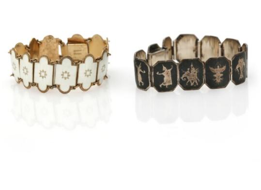 Two bracelets respectively set with enamel or niello