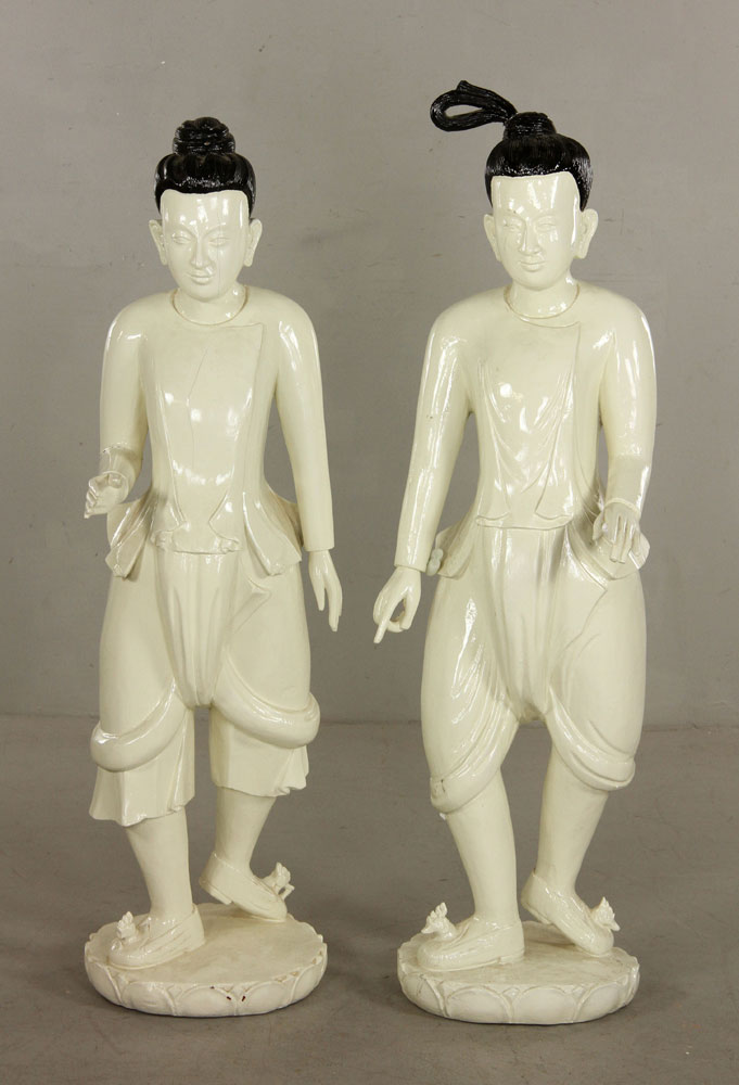 Lot of two Chinese figures, carved and painted wood, taller 45" h. Provenance: From the collection of interior designer Thomas Britt.
