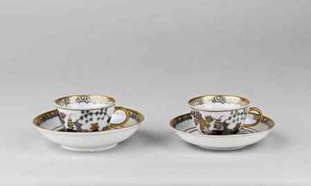 Underglaze blue rock and bird painting with Goldübermalung. Blue swords Meissen, 1740