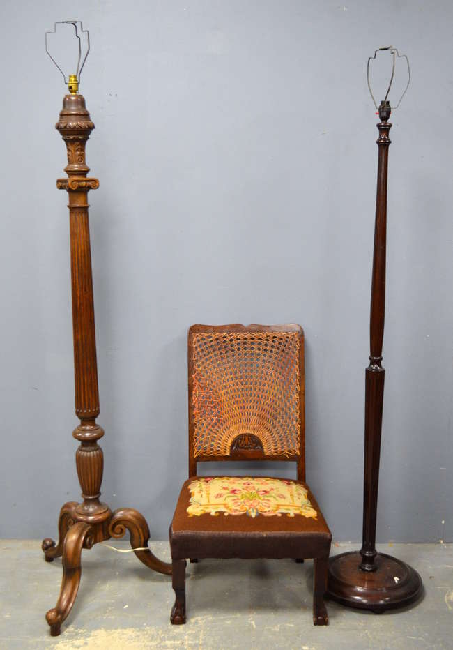 Two mahogany standard lamps and a cane backed chair