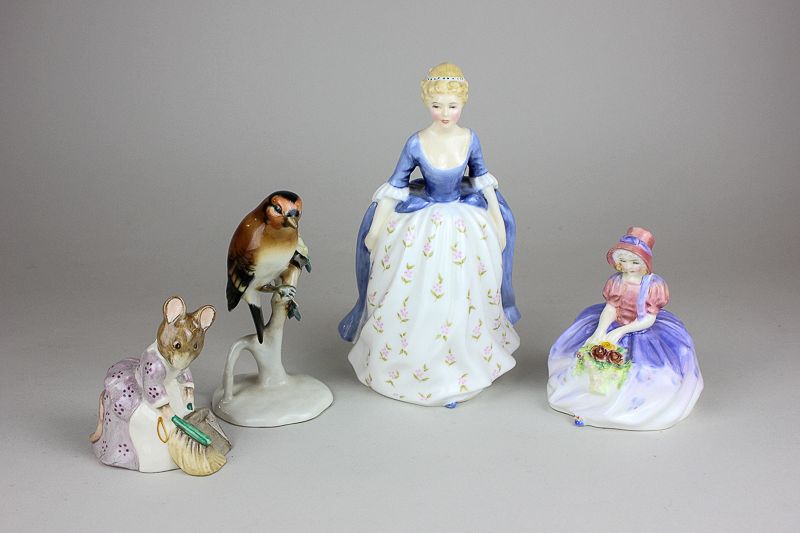 together with a Royal Dux figure of a house finch and a Royal Albert Beatrix Potter figure, Hunca Munca sweeping