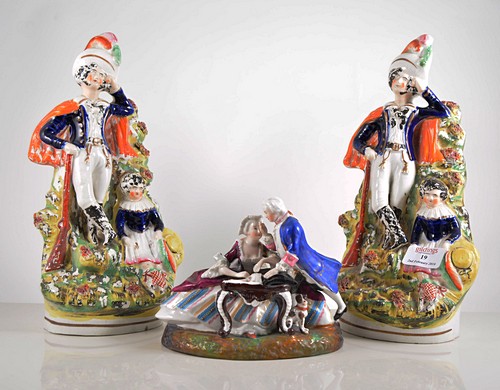 Two Staffordshire pottery models, painted in colours, height 30cm and a Continental porcelain group of figures, (3).