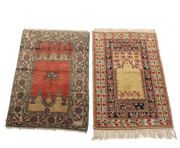 Two Turkish rugs, classic niche design with repeating pattern on red and light base