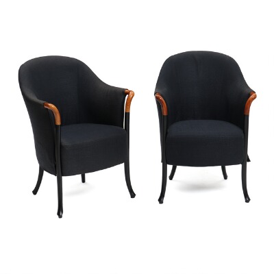 “Progetti”. A pair of easy chairs with slightly curved, black lacquered legs, walnut armrests. Seat, sides and back upholstered with black patterned fabric. Designed 1987. Manufactured and marked by Giorgetti, Italy. (2)