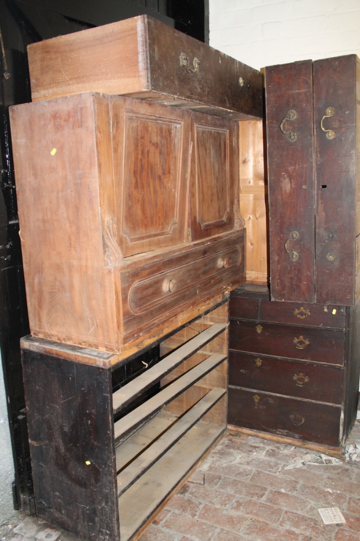 to include an 18thC oak chest of two short and three long drawers each with pierced plate back and swan neck handles, 84cm high, 96cm wide, 39cm deep, open shelves, etc. (a quantity, barn finds, AF)